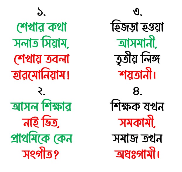 তিনি বলেন, ‘আমরা মনে করি, মৌলিক শিক্ষায় যখন ভয়াবহ ঘাটতি, তখন সংগীতের শিক্ষক নিয়োগ দেওয়া শিক্ষানীতির সাথে সাংঘর্ষিক এবং অগ্রাধিকারভিত্তিক জাতীয় স্বার্থবিরোধী। উল্লেখ্য, ইসলামে বাদ্যযন্ত্রের ব্যবহার নিষিদ্ধ হওয়া সত্ত্বেও ৯২% মুসলিমের ট্যাক্সের টাকায় তাদের সন্তানদের বাধ্যতামূলকভাবে সংগীতের নামে বাদ্যযন্ত্রের ব্যবহার শেখানো রাষ্ট্রের উগ্র ইসলামবিদ্বেষী সাম্প্রদায়িকতারই বহিঃপ্রকাশ।’