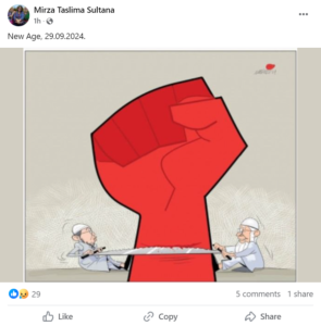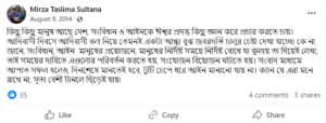 - পাঠ্যপুস্তক কমিটির মির্জা তাসলিমা সুলতানার ইসলামোফোবিয়া, এলিজিবিটি সমর্থন এবং পাবর্ত্য চট্টগ্রাম বিষয়ক অবস্থানের ফেসবুক পোস্টের স্ক্রিনশট নিম্নরুপ: