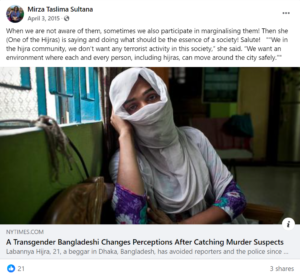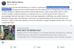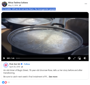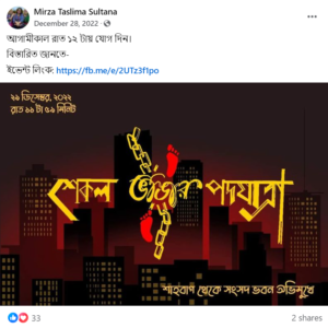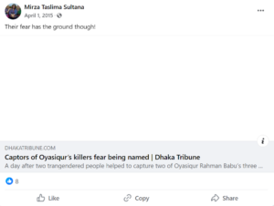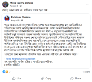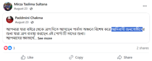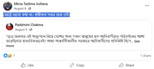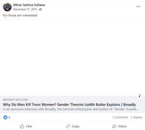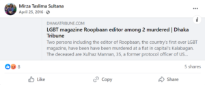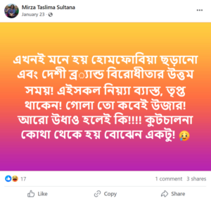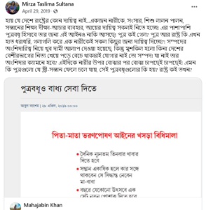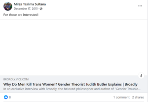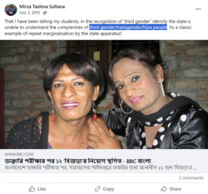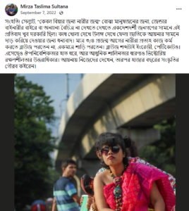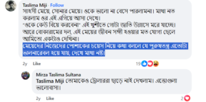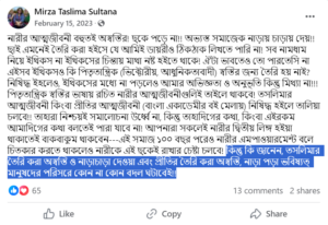 - পাঠ্যপুস্তক কমিটির মির্জা তাসলিমা সুলতানার ইসলামোফোবিয়া, এলিজিবিটি সমর্থন এবং পাবর্ত্য চট্টগ্রাম বিষয়ক অবস্থানের ফেসবুক পোস্টের স্ক্রিনশট নিম্নরুপ: