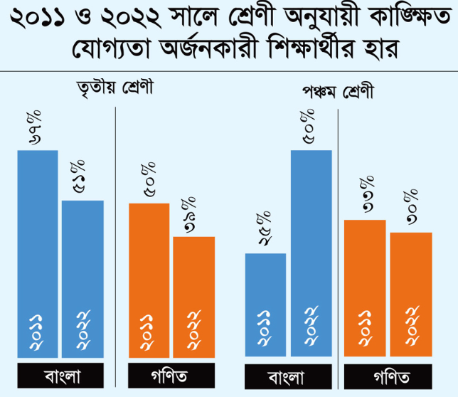 চিত্রঃ ২০১১ ও ২০২২ সালে ৩য় ও ৫ম শ্রেণীর কাঙ্ক্ষিত যোগ্যতা অর্জনকারী শিক্ষার্থীর হার